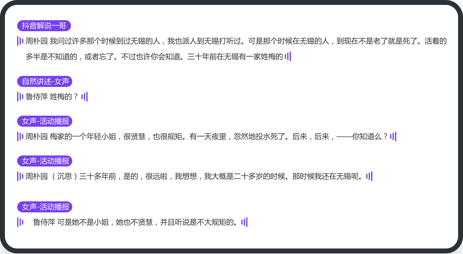 店里經(jīng)常會(huì)做一些促銷(xiāo)廣告需要配音,之前一直是找真人配音,配音時(shí)間長(zhǎng)價(jià)格也貴,經(jīng)銷(xiāo)商給我推薦的牛片配音,聲音真的超級(jí)真實(shí),完全聽(tīng)不出來(lái)是機(jī)器合成,關(guān)鍵是機(jī)器不滿(mǎn)意還能選擇真人免費(fèi)試音。